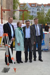 Dank des milden Winters sind die Tiefbau- und Leitungsarbeiten in der Hobrechtstraße 32 abgeschlossen. Am 8. April wurde der Grundstein in Anwesenheit des Neuköllner Baustadtrats Thomas Blesing, des Gesundheits- und Jugendstadtrats Falko Liecke, der Architektin Gabriele Fink und des Geschäftsführers des Trägers LebensWelt - Kindertagesstätten Yuvam gGmbH gelegt.