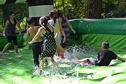Auch abseits der Bühne tobte das Leben, denn dort wurde für große und kleine Menschen jede Menge zum Mitmachen oder auch zum Genießen angeboten. Turniere lockten die ehrgeizigen und sportlichen Besucher an, doch auch Nachdenken war an der einen oder anderen Stelle gefragt, so beispielsweise beim naturwissenschaftlichen Brückenbauwettbewerb. Erfrischung gab es beim Watersoccer und in Form kalter Getränke an zahlreichen Ständen.